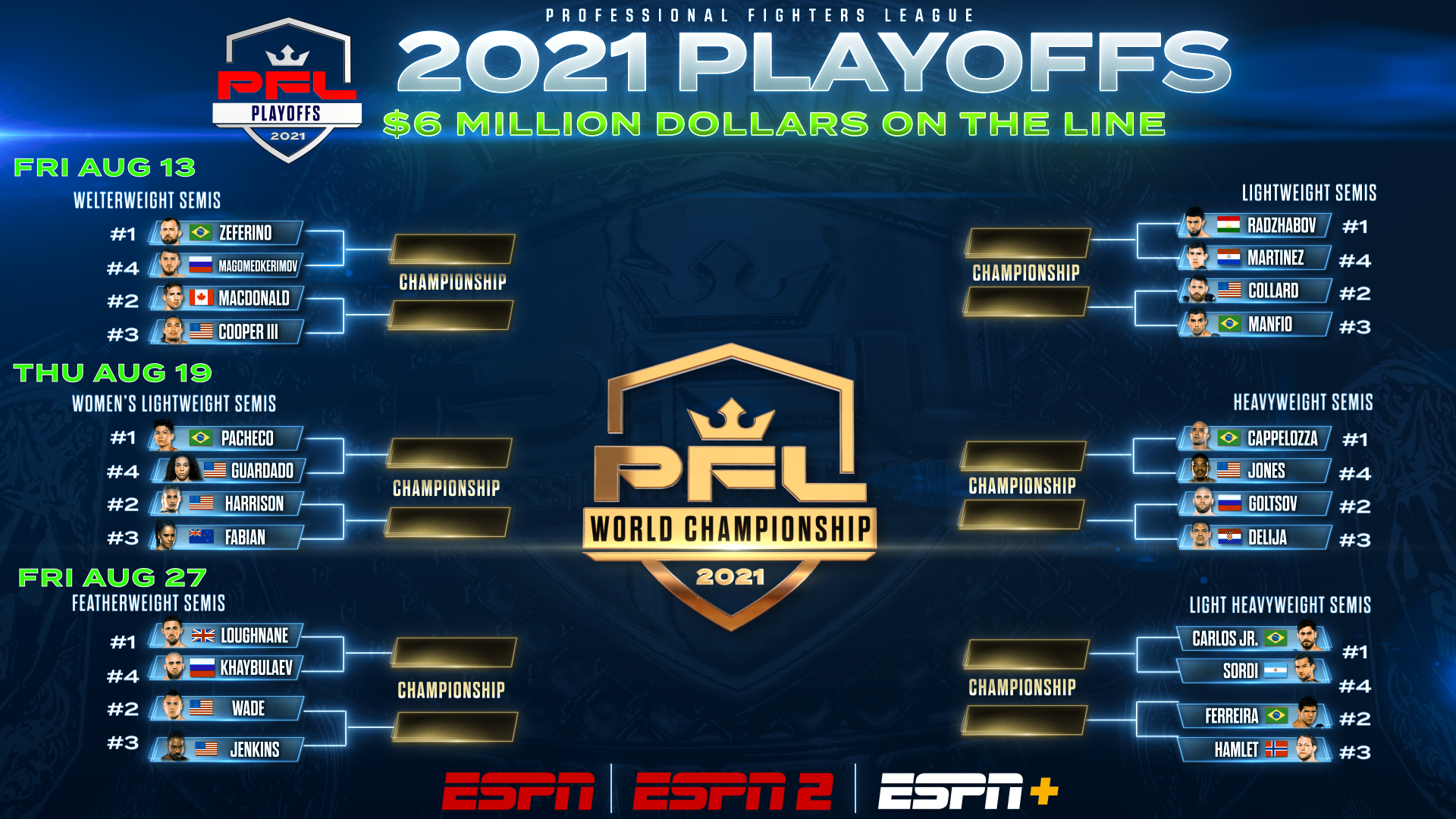 ET prelims 430 pm Location. PFL 1 PFL 2 PFL 3 PFL 4 PFL 5 PFL 6 Aug 13 Playoffs Aug 19 Playoffs Aug 27 Playoffs Oct 27. The Professional Fighters League PFL the fastest growing and most innovative sports league is set for the 2021 World Championship event on October 27 on ESPN2 and ESPN English and Spanish.